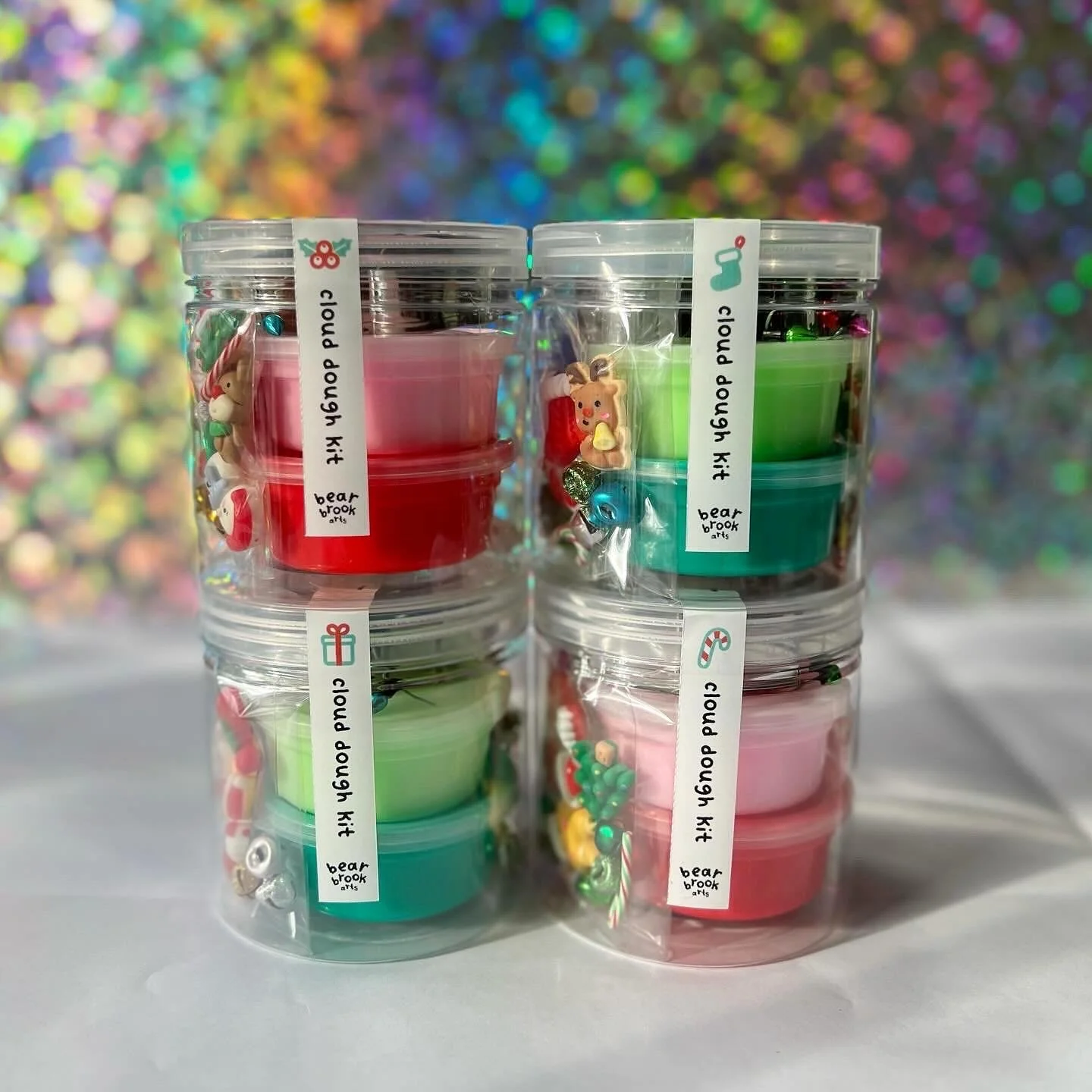 This sensory play kit includes a holiday cookie cutter, 2 mini air dry clay pots, pom poms, 2 confetti mix-ins, a string of lights and tiny bottle of glitter. ✨